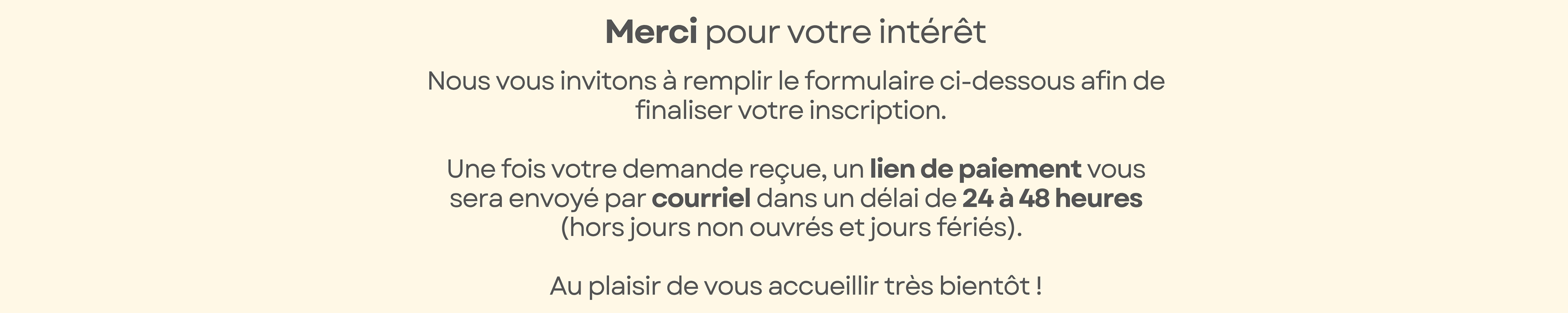 Merci pour votre intérêt, un lien de paiement vous sera adressé par courriel dans un délai de 24 heures hors jours non ouvrés et fériés.À très bientôt